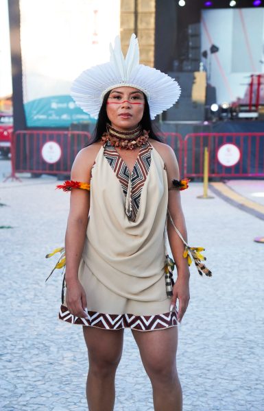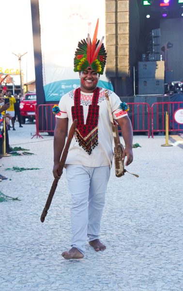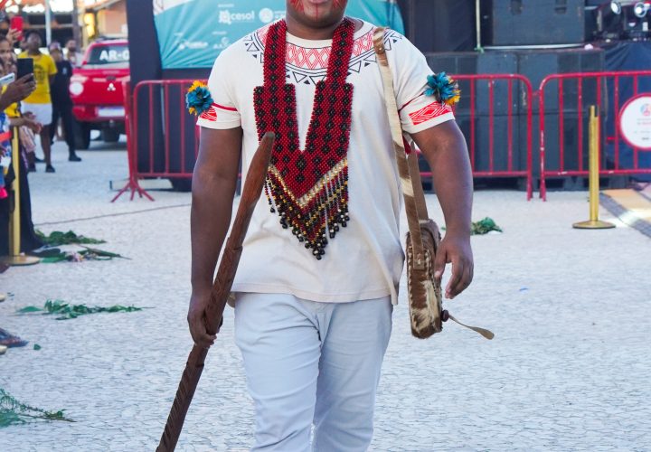 Ao som de Beatriz Tuxá, o desfile foi marcado por emoção e resistência. Em uma das peças, o manifesto “O Brasil começa aqui” sintetizou, de forma simbólica, a memória e a luta dos povos originários.