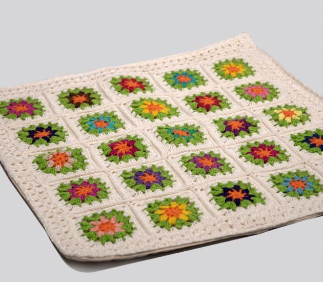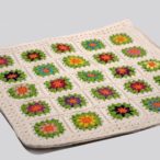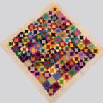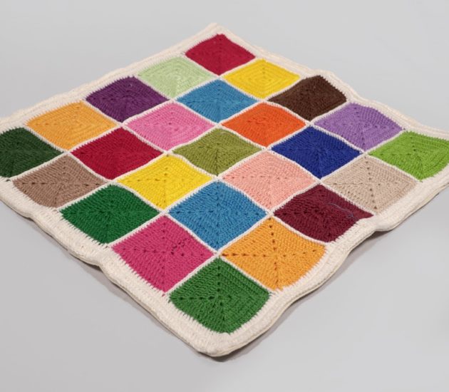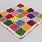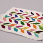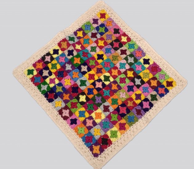 Capa de almofada quadrada em tecido 100% algodão com crochê colorido.